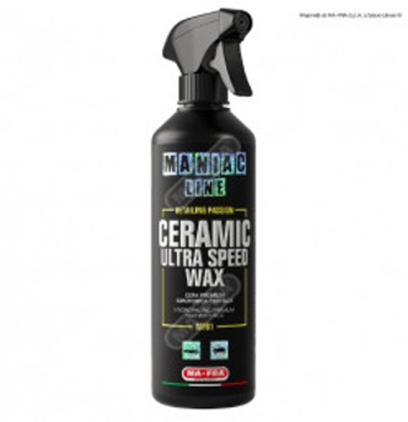 Ceramic Ultra Speed Wax della Maniac Line™ di Mafra è una cera spray sigillante che contiene polimeri ceramici SiO2 super-idrofobici che si legano alla superficie creando uno scudo protettivo autopulente.