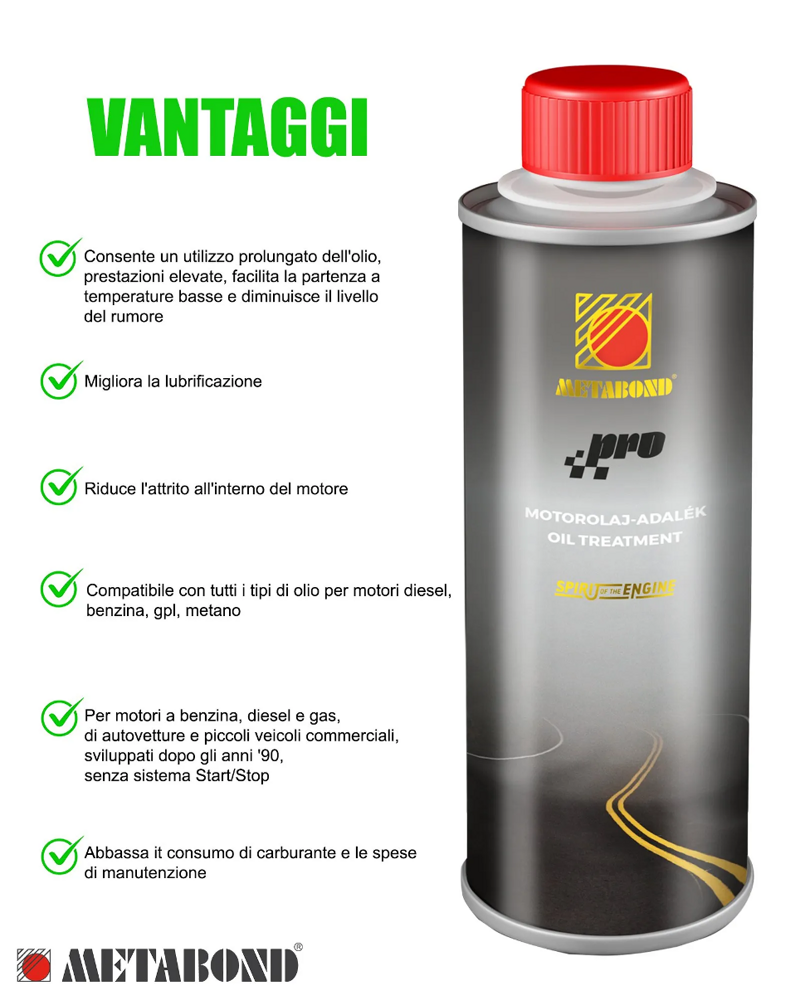 METABOND PRO è un prodotto per il trattamento antiattrito del motore termico, realizzato con una maggiore concentrazione di additivi. Consente un utilizzo prolungato dell'olio, prestazioni elevate, facilita la partenza a temperature basse e diminuisce il livello del rumore. Il prodotto contiene nanoparticelle di ceramica.
